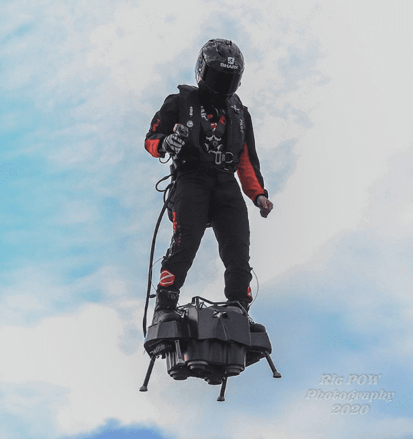 The Flyboard Air is a prototype hoverboard developed by French inventor Franky Zapata, who also holds several flyboarding world records. The Flyboard Air is designed to allow the user to fly through the air using jet propulsion, and it has been demonstrated to be able to fly for extended periods of time.